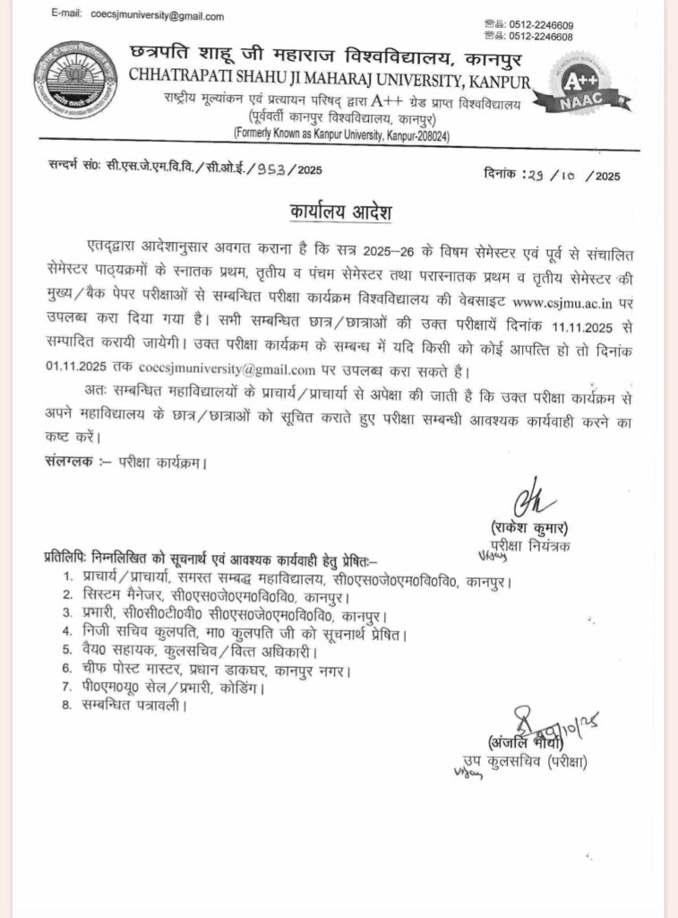 छत्रपति शाहू जी महाराज विश्वविद्यालय (CSJMU), कानपुर ने सत्र 2025–26 की विषम सेमेस्टर परीक्षाओं का विस्तृत कार्यक्रम जारी कर दिया है।