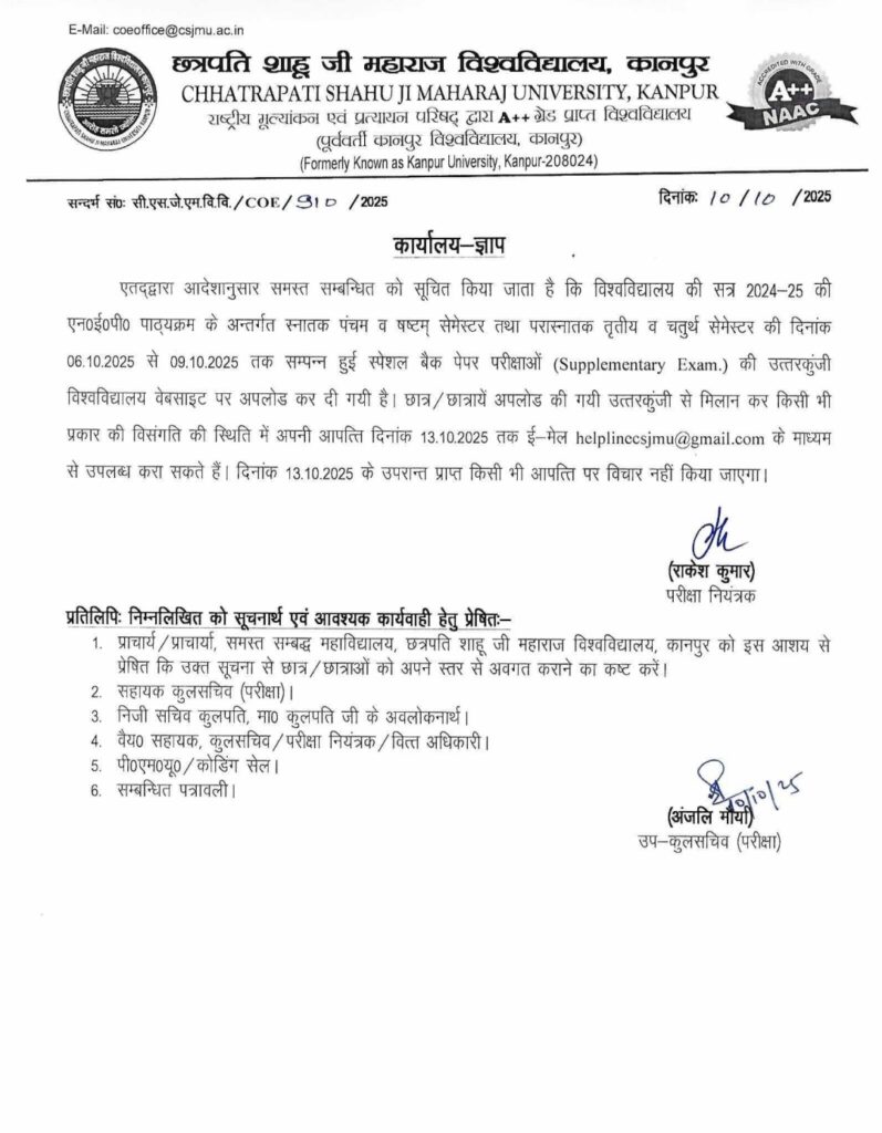 छत्रपति शाहू जी महाराज विश्वविद्यालय, कानपुर (CSJMU) ने सत्र 2024–25 के अंतर्गत आयोजित Supplementary Exam 2025 की Answer Key जारी कर दी है।